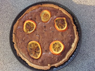 You slice two oranges and cook them in a sugar syrup (mixture of sugar and water); bake the pastry case blind and then make the filling from ground almonds, butter, sugar and eggs then dark chocolate. Add some of the orange slices which you have chopped while keeping the rest for decoration, and bake the assembled tart in the oven.
