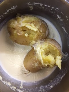 If you are using leftover potatoes, chop the potatoes and put into a pan of milk so the potatoes are just covered and bring the milk to simmering point. Remove from the heat allow to cool; put the potatoes and some of the milk into a food processor as before then return to the pan and stir through, and reheat if you are eating this now.
